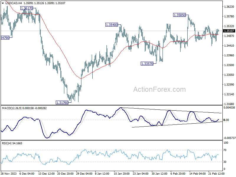 USD/CAD is staying in sideway trading below 1.3585 and intraday bias remains neutral. With 1.3357 support intact, further rally is expected. On the upside, break of 1.3585 will resume the rebound from 1.3176 for 1.3897 resistance. However, break of 1.3357 will argue that the rebound from 1.3176 has completed and bring retest of this low.