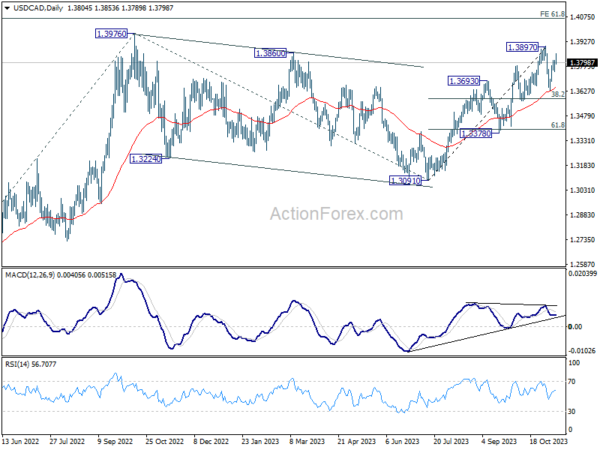 In the bigger picture, corrective pattern from 1.3976 (2022 high) should have completed with three waves down to 1.3091. Decisive break of 1.3976 high will confirm resumption of up trend from 1.2005 (2021 low). Next target is 61.8% projection of 1.2401 to 1.3976 from 1.3091 at 1.4064. This will remain the favored case as long as 1.3378 support holds.