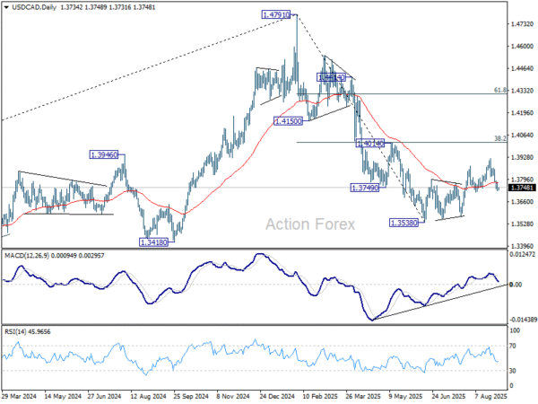 Intraday bias in USD/CAD remains on the upside at this point. Pullback from 1.3923 could have completed at 1.3725 already, and corrective rebound from 1.3538 is possibly resuming. Further rise should be seen to retest 1.3923 first. For now, risk will stay on the upside as long as 1.3725 support holds, in case of retreat.