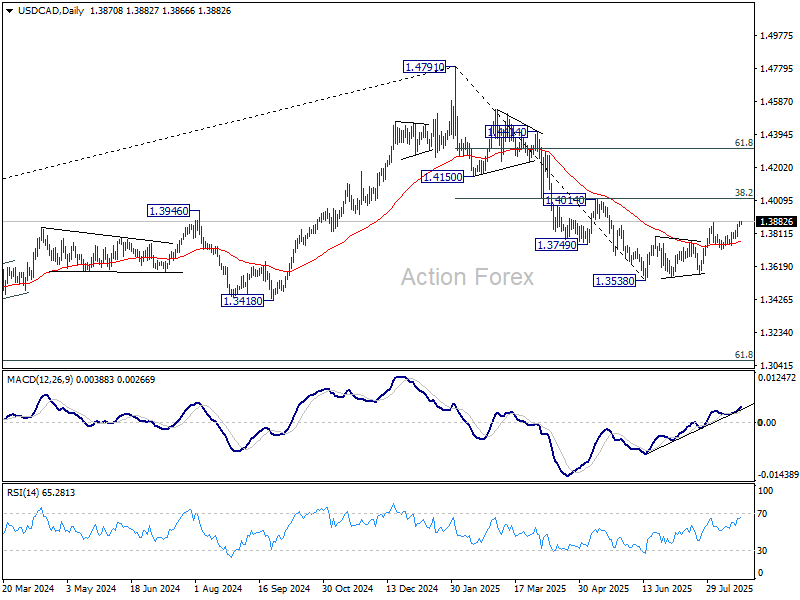 Intraday bias in USD/CAD remains on the upside at this point. Pullback from 1.3923 could have completed at 1.3725 already, and corrective rebound from 1.3538 is possibly resuming. Further rise should be seen to retest 1.3923 first. For now, risk will stay on the upside as long as 1.3725 support holds, in case of retreat.