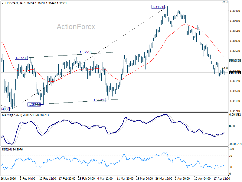 Intraday bias in USD/CAD remains on the downside despite loss of momentum. Sustained trading below 61.8% retracement of 1.3480 to 1.3965 at 1.3665 will pave the way to retest 1.3480 low. On the upside, above 1.3708 minor resistance will turn intraday bias neutral again first.