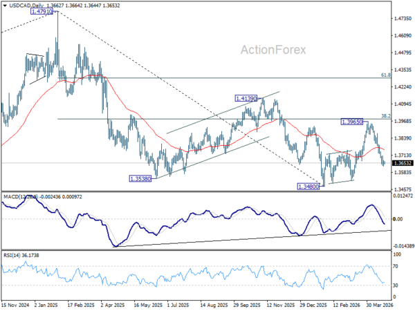 Intraday bias in USD/CAD is turned neutral with current recovery and some consolidations could be seen above 1.3647. Further decline is expected as long as 1.3787 resistance hold. Sustained break of 61.8% retracement of 1.3480 to 1.3965 at 1.3665 will pave the way to retest 1.3480 low.