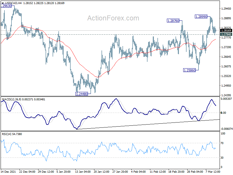 Intraday bias in USD/CAD stays neutral with mixed outlook. On the upside, break of 1.2899 will target 1.2963 resistance first. Break there will target key long term fibonacci level at 1.3022. However, break of 1.2586 will bring retest of 1.2448 support instead.