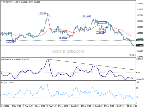 USD/CAD’s consolidation from 1.2286 continued last week and outlook is unchanged. Upside should be limited by 1.2497 to complete the consolidation to bring fall resumption. On the downside, break of 1.2286 will resume the fall from 1.2947 to retest 1.2005 low. However, firm break of 1.2497 will turn bias back to the upside for stronger rebound.
