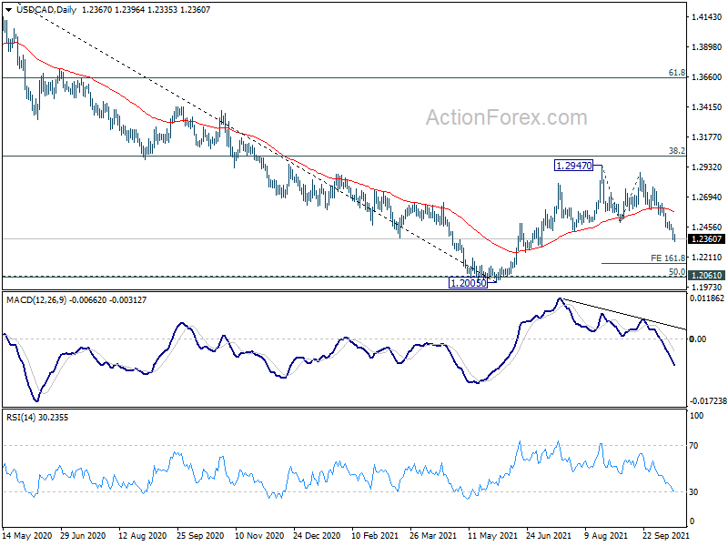 USD/CAD’s consolidation from 1.2286 continued last week and outlook is unchanged. Upside should be limited by 1.2497 to complete the consolidation to bring fall resumption. On the downside, break of 1.2286 will resume the fall from 1.2947 to retest 1.2005 low. However, firm break of 1.2497 will turn bias back to the upside for stronger rebound.