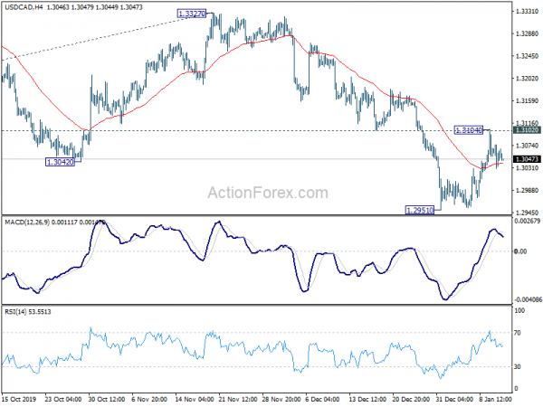 Intraday bias in USD/CAD remains neutral for consolidation below 1.3171 temporary top. We’re favoring the case that corrective pattern from 1.3664 has completed as a triangle at 1.2951. Further rise is expected as long as 1.3036 support holds. Above 1.3171 will target 1.3327 resistance to confirm this bullish view. Nevertheless, break of 1.3036 will dampen this view and bring retest of 1.2951 low.