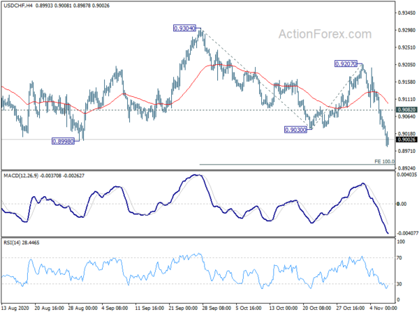 Intraday bias in USD/CHF remains mildly on the downside for retesting 0.8982 low. Firm break there will resume later down trend. On the upside, break of 0.9207 resistance is needed to be the first sign of bullish reversal. Otherwise, outlook will stay bearish in case of another rebound.