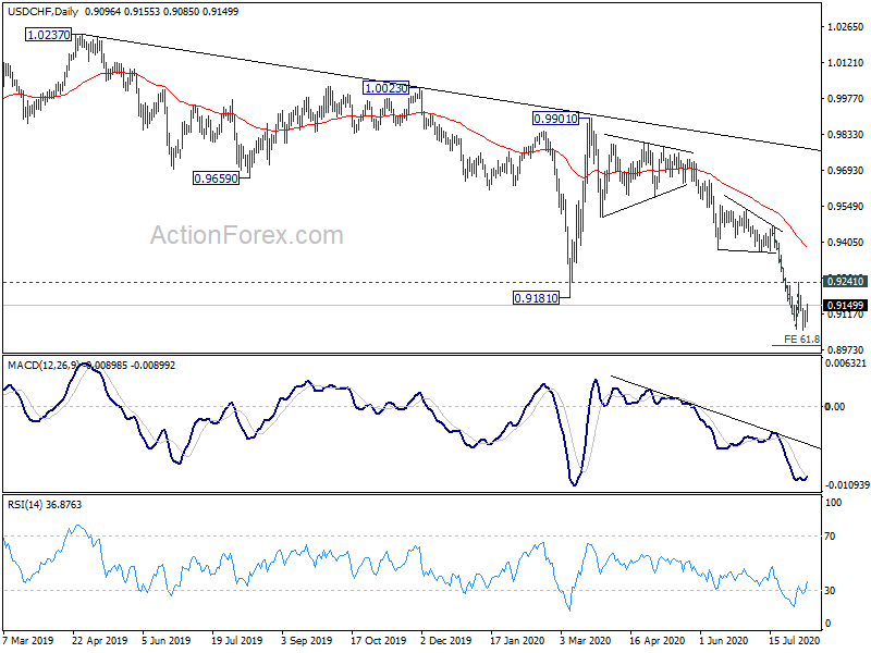 Intraday bias in USD/CHF remains neutral first. Further decline is still in favor as long as 0.9241 resistance holds. On the downside, break of 0.9050 will resume larger down trend to 61.8% projection of 0.9467 to 0.9056 from 0.9241 at 0.8987. Nevertheless, firm break of 0.9241 will indicate short term bottoming and turn bias back to the upside for rebound.