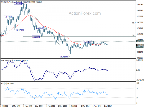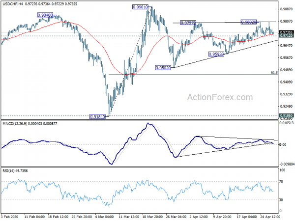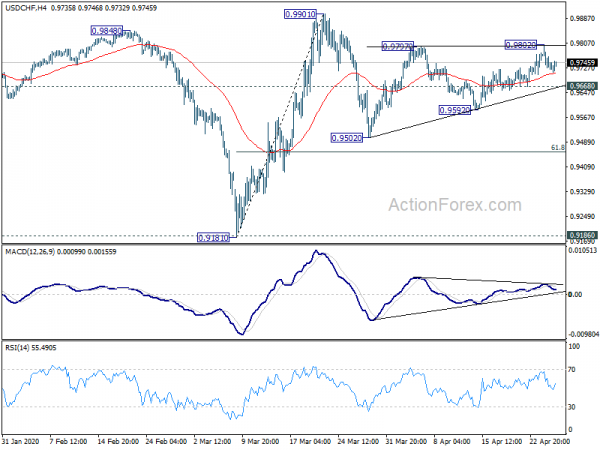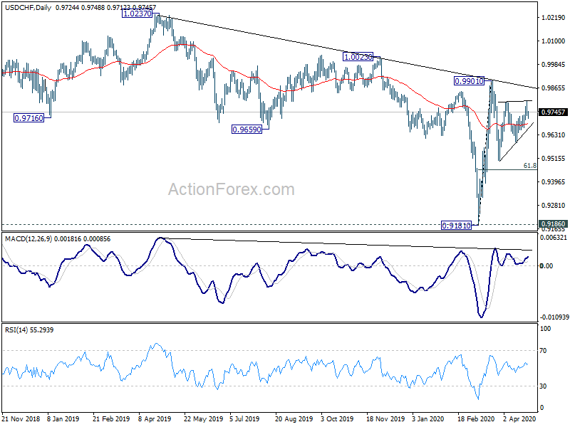 USD/CHF’s rebound last week was limited below 0.9802 resistance. Initial bias remains neutral this week first. Corrective pattern from might extend further. Break of 0.9681 minor support will turn bias to the downside for 0.9588 support and below. Overall, downside should be contained by 61.8% retracement of 0.9181 to 0.9901 at 0.9456 to rebound. On the upside, break of 0.9802 will target a test on 0.9901 high.
