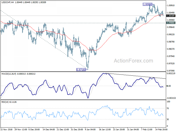 Further decline is mildly in favor in USD/CHF as long as 1.0024 minor resistance holds. Sustained trading below 55 day EMA (now at 0.9969) should confirm completion of rise form 0.9716, after rejection by 1.0128 resistance. In that case, deeper fall would be seen back towards 0.9716 support. On the upside, break of 1.0024 minor resistance will turn bias back to the upside for 1.0098 instead.