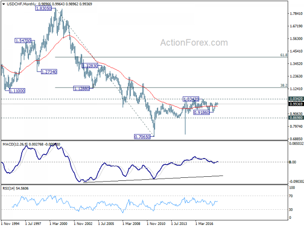 In the bigger picture, current development suggests that the consolidation pattern from 1.0056 is extending with another leg. As long as 38.2% retracement of 0.9186 to 1.0056 at 0.9724 holds, we’d expect rise from 0.9186 to resume at a later stage to retest 1.0342 key resistance (2016 high). However, sustained break of 0.9724 fibonacci level will bring deeper fall, as another declining leg in the long term range pattern.
