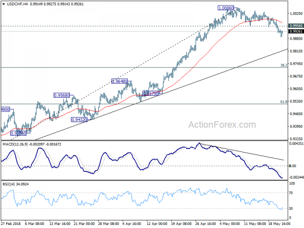 Intraday bias in USD/CHF is turned neutral with today’s recovery. Focus is back on 0.9977 minor resistance. Break there will argue that corrective pull back from 1.0056 has completed already. Intraday bias will then be turned back to the upside for retesting 1.0056 high first. In case of another fall, we’d expect strong support from trend line (now at 0.9842) to contain downside and bring rebound. However, sustained break of the trend line will argue that it’s a larger scale correction and will target 0.9724 fibonacci level.