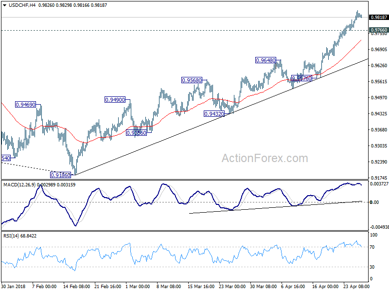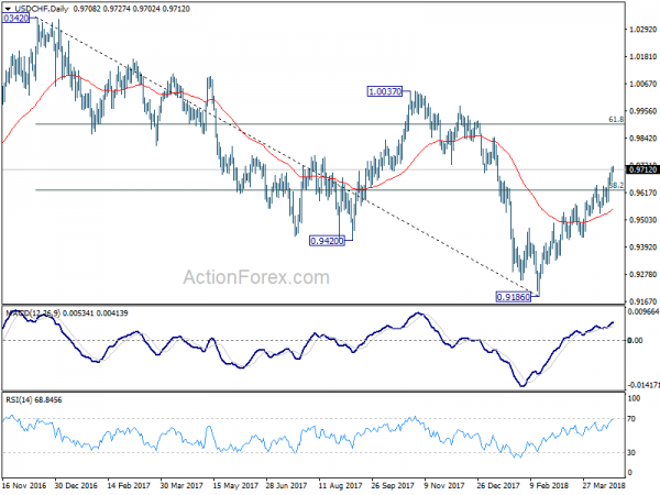In the bigger picture, medium term decline from 1.0342 has completed with three waves down to 0.9186. Rise from there is currently viewed as a leg inside the long term range pattern. Hence, while further rally would be seen, we’d be cautious on strong resistance from 1.0342 to limit upside. For now, further rise is expected as long as 0.9648 resistance turned support holds, even in case of pull back.