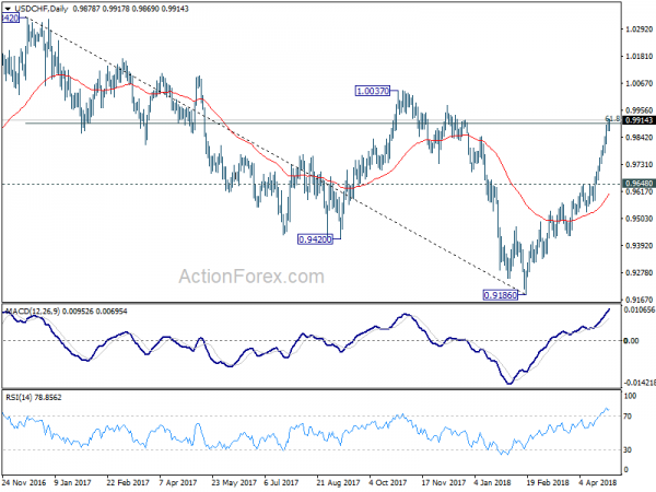 With 0.9919 minor support intact, intraday bias in USD/CHF remains on the upside. Current rally from 0.9186 would target 1.0037 resistance. Decisive break there will pave the way to key resistance level at 1.0342. On the downside, below 0.9919 minor support will turn intraday bias neutral again and bring consolidation, before staging another rise.