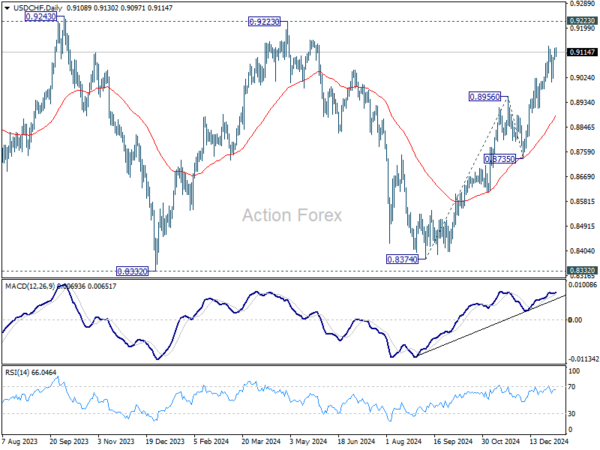 USD/CHF’s retreat from 0.9200 extends lower today, but stays above 0.9007 support. Intraday bias remains neutral for the moment. Near term outlook will stay bullish. On the upside, decisive break of 0.9223 will carry larger bullish implications.