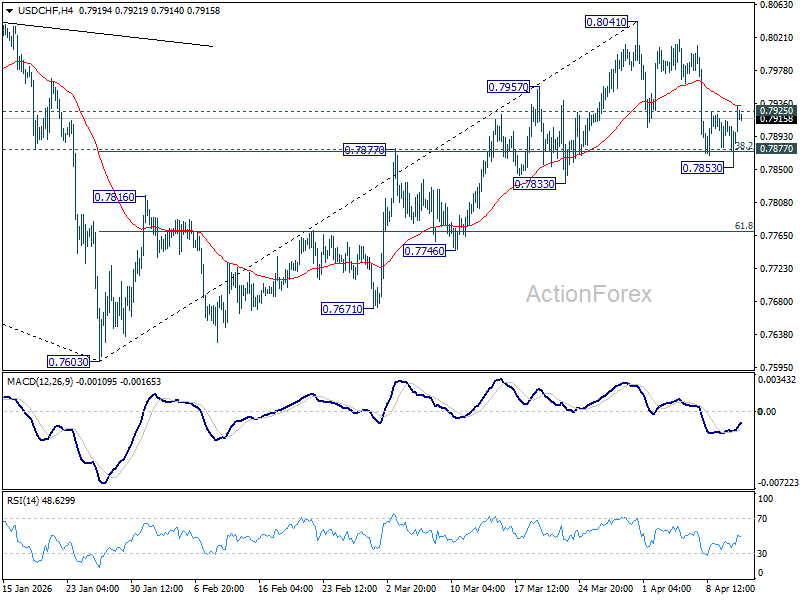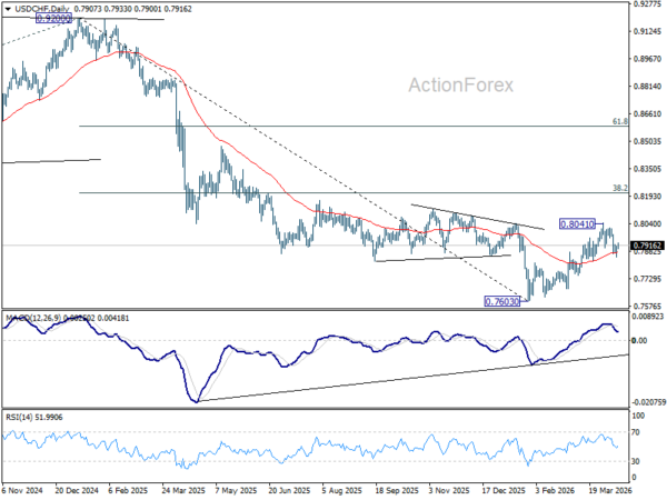 Intraday bias in USD/CHF remains neutral for the moment. On the downside, sustained trading below 0.7877 cluster support (38.2% retracement of 0.7603 to 0.8041 at 0.7874) will argue that the rise from 0.7603 has completed, and bring deeper fall to 61.8% retracement at 0.7770 and below. Nevertheless, firm break of 0.7925 minor resistance will turn bias back to the upside for retesting 0.8041.
