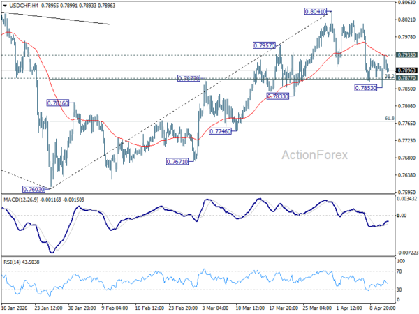 Intraday bias in USD/CHF remains neutral for the moment. On the downside, sustained trading below 0.7877 cluster support (38.2% retracement of 0.7603 to 0.8041 at 0.7874) will argue that the rise from 0.7603 has completed, and bring deeper fall to 61.8% retracement at 0.7770 and below. Nevertheless, firm break of 0.7925 minor resistance will turn bias back to the upside for retesting 0.8041.