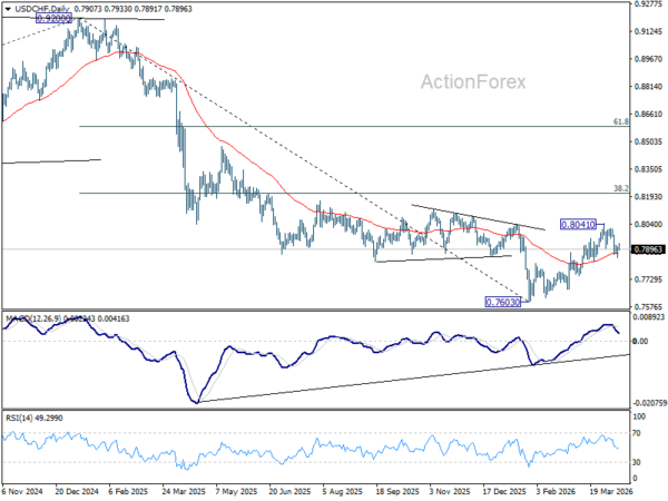 Intraday bias in USD/CHF stays neutral at this point. On the downside, sustained trading below 0.7877 cluster support (38.2% retracement of 0.7603 to 0.8041 at 0.7874) will argue that the rise from 0.7603 has completed, and bring deeper fall to 61.8% retracement at 0.7770 and below. Nevertheless, firm break of 0.7925 minor resistance will turn bias back to the upside for retesting 0.8041.