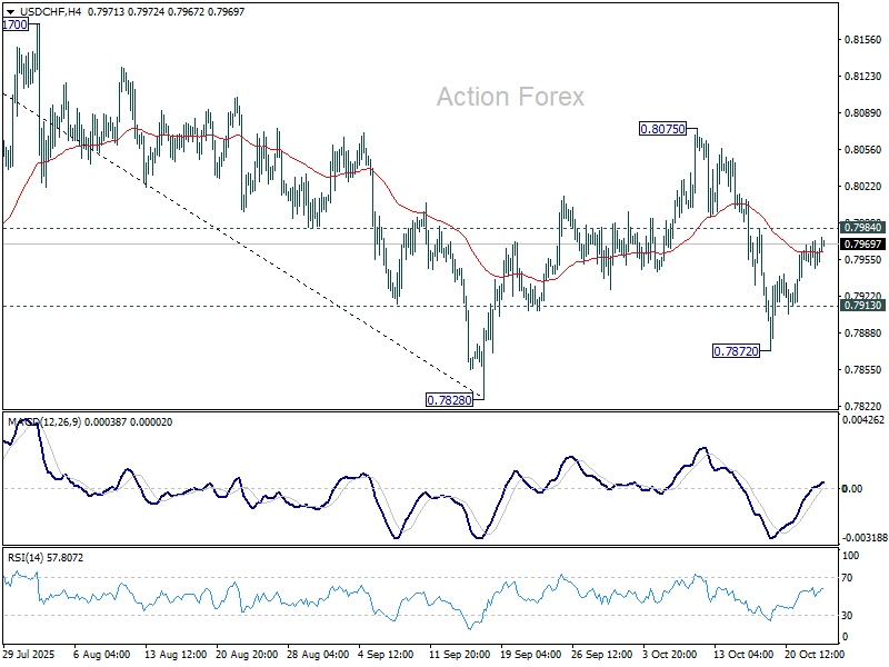 Intraday bias in USD/CHF stays neutral as range trading continues. Deeper decline is still in favor with 0.7984 resistance intact. On the downside, below 0.7913 will turn bias to the downside for 0.7872 support, and then 0.7828 low. However, firm break of 0.7984 will suggest that corrective pattern from 0.7828 is extending with another rising leg, and target 0.8075 again.