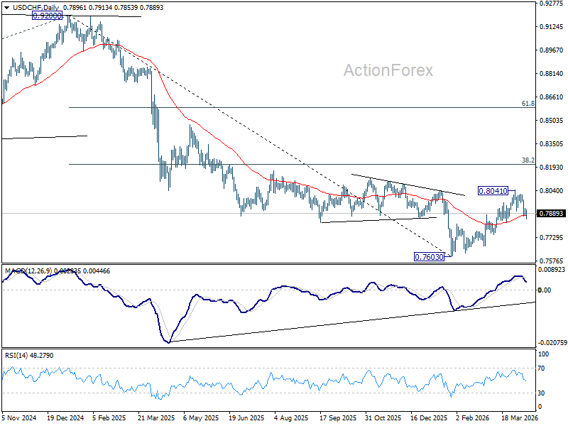 Intraday bias in USD/CHF remains neutral and outlook is unchanged. With 0.7877 cluster support (38.2% retracement of 0.7603 to 0.8041 at 0.7874) intact, rally from 0.7603 is expected to resume through 0.8041 later. However, decisive break of 0.7874/7 will argue that the rise has completed, and bring deeper fall to 61.8% retracement at 0.7770 and below.