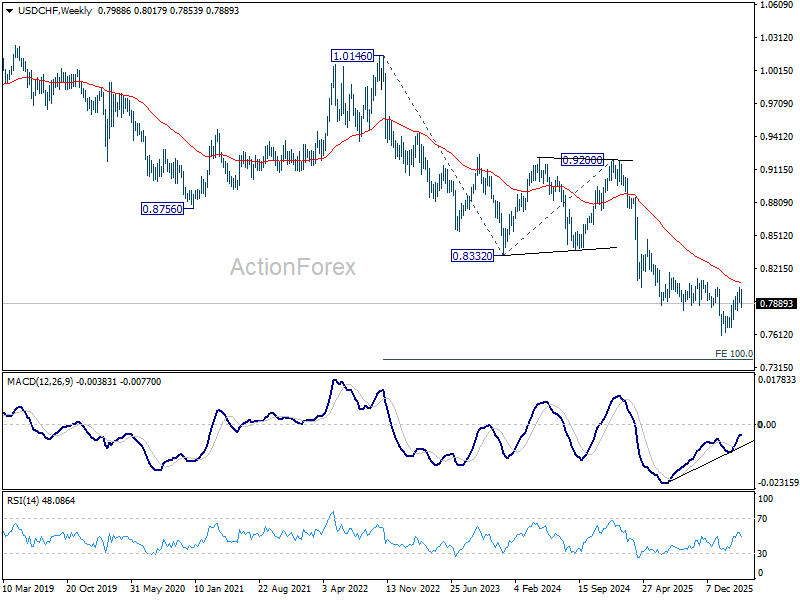 In the bigger picture, rebound from 0.7603 medium term bottom is seen as correcting the fall from 0.9200 only. rejection by 55 W EMA (now at 0.8081) will affirm this case, and setup down trend resumption to 100% projection of 1.0146 (2022 high) to 0.8332 from 0.9200 at 0.7382 at a later stage. Though, sustained break of 55 W EMA will suggest that it's probably correcting the larger scale down trend from 1.0146 (2022 high).