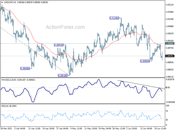 Intraday bias in USD/CHF remains neutral for the moment. On the upside, above 0.9011 will bring stronger rise towards 0.9146 resistance. On the downside, through, break of 0.8900 will target 0.8818 and possibly below.