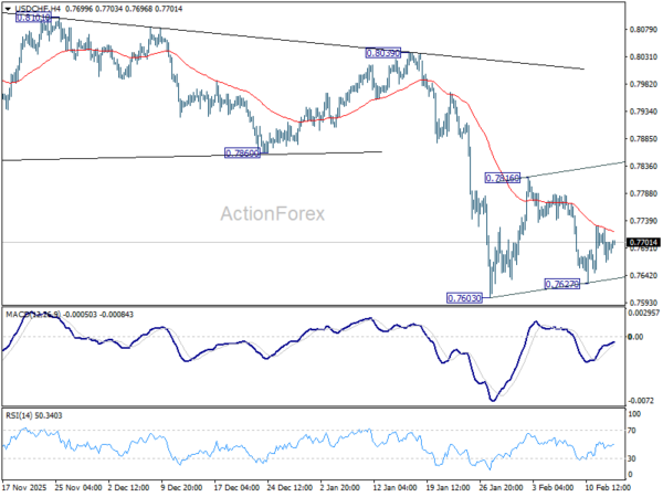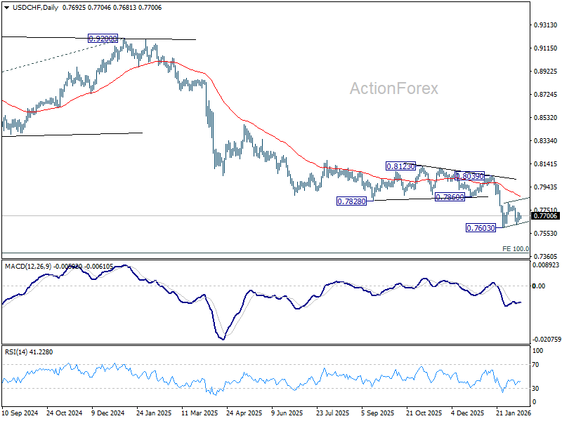 Intraday bias in USD/CHF remains neutral. Consolidations from 0.7603 is extending and stronger rebound could be seen to 0.7816 resistance. But upside should be limited by 55 D EMA (now at 0.7874). On the downside, firm break of 0.7603 will resume larger down trend to 0.7382 projection level next.