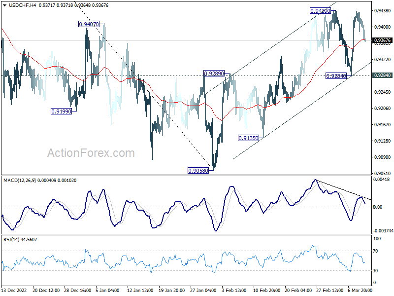 Intraday bias in USD/CHF remains neutral and outlook is unchanged. Corrective pattern from 0.9058 low should still be in progress with rise from 0.9070 as the third leg. Above 0.9339 will target 0.9439 resistance and possibly above. But overall, outlook will stay bearish as long as 0.9474 fibonacci level holds, and another decline through 0.9058 is expected at a later stage.