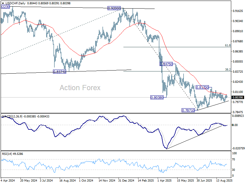 USD/CHF’s fall from 0.8170 extended lower last week after interim recovery. The development aligns with the case that corrective rebound from 0.7871 has completed at 0.8170. Initial bias is now on the downside this week for retesting 0.7871. For now, risk will stay on the downside as long as 0.8071 resistance holds, in case of recovery.