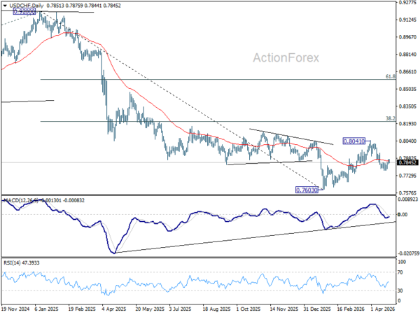 Intraday bias in USD/CHF remains neutral at this point. Further decline is expected as long as 0.7933 resistance holds. On the downside, sustained break 61.8% retracement of 0.7603 to 0.8041 at 0.7770 will resume the decline from 0.8041 to retest 0.7603 low. However, break of 0.7933 will bring retest of 0.8041 high instead.