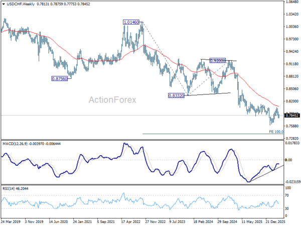 USD/CHF turned into consolidations last week and recovered, but overall outlook is unchanged. Initial bias remains neutral this week first. On the downside sustained break of 61.8% retracement of 0.7603 to 0.8041 at 0.7770 will pave the way to retest 0.7603 low. However, break of 0.7933 resistance will bring stronger rise back to retest 0.8041 high.