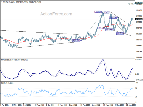 In the bigger picture, current development suggests that up trend from 0.8756 (2021 low) is still in progress. Sustained break of 1.0063 will target 100% projection of 0.9149 to 1.0063 from 0.9369 at 1.0283, and then 1.0342 (2016 high). For now, this will remain the favored case as long as 0.9369 support holds, even in case of deep pull back.