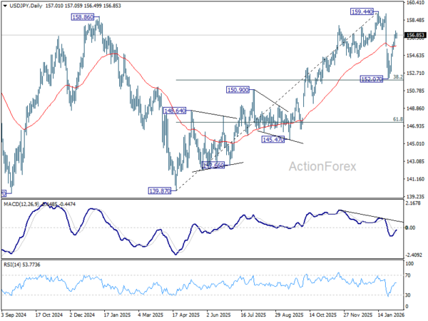 Intraday bias in USD/JPY stays neutral and outlook is unchanged. While another fall cannot be ruled out, strong support should be seen from 38.2% retracement of 139.87 to 159.44 at 151.96 to bring rebound. On the upside, sustained break of 55 4H EMA (now at 154.70) will bring stronger rebound towards 157.65. However, sustained break of 151.96 will argue that it's reversing the rise from 139.87 already. In this case, deeper fall should then be seen to 61.8% retracement at 147.34, and possibly below.