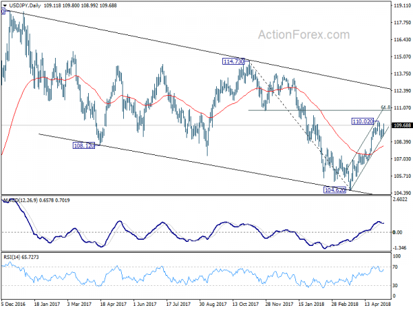 Intraday bias in USD/JPY remains neutral and outlook is unchanged. Consolidation from 110.02 is extending and deeper fall could be seen through 108.64. But downside should be contained by 38.2% retracement of 104.62 to 110.02 at 107.95 to bring rally resumption. On the upside, break of 110.02 will resume the rise from 104.62 to 61.8% retracement of 114.73 to 104.62 at 110.86 next.