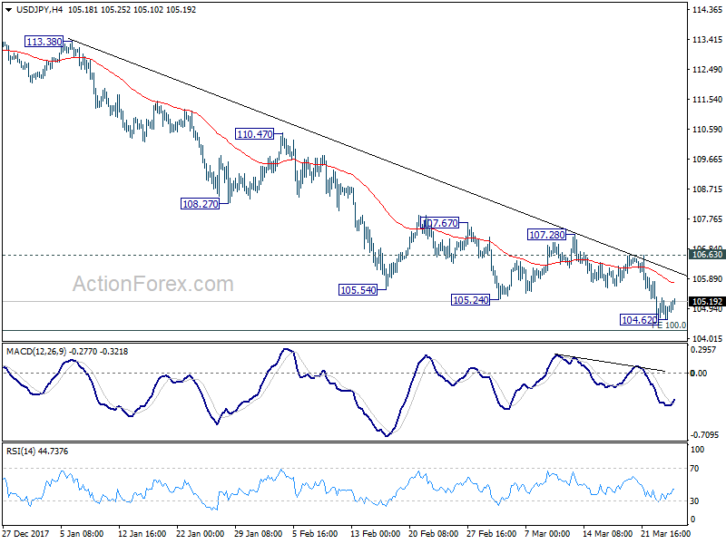 Intraday bias in USD/JPY stays neutral first. With 105.31 minor support intact, further rise is mildly in favor. Above 107.00 will target 38.2% retracement of 114.73 to 104.62 at 108.48. At this point, there is no confirmation of trend reversal yet. Hence, we’ll look at the reaction from 108.48 (which is close to 108.12 too) to assess the chance. On the downside, below 105.31 minor support will indicate that the rebound is completed and turn bias back to the downside for 104.62 and below.