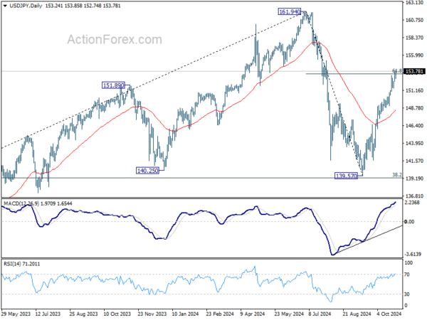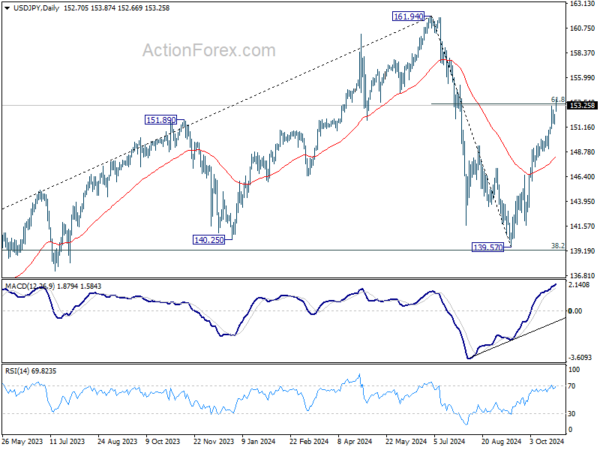 Intraday bias in USD/JPY remains neutral as consolidation from 153.87 is extending. Deeper retreat cannot be ruled out but further rally is expected as long as 55 D EMA (now at 148.95) holds. Sustained trading above 61.8% retracement of 161.94 to 139.57 at 153.39 will pave the way to retest 161.94 high.