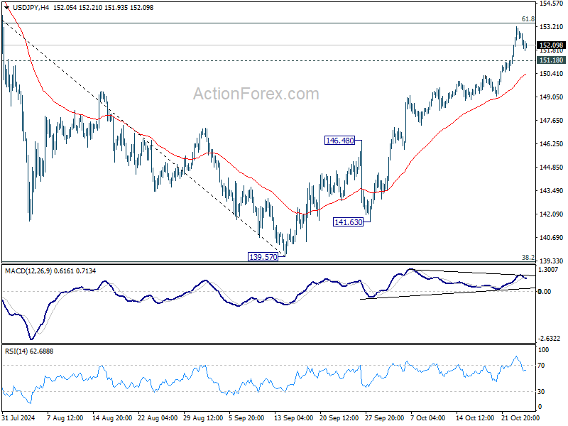 Intraday bias in USD/JPY remains neutral as consolidation from 153.87 is extending. Deeper retreat cannot be ruled out but further rally is expected as long as 55 D EMA (now at 148.95) holds. Sustained trading above 61.8% retracement of 161.94 to 139.57 at 153.39 will pave the way to retest 161.94 high.