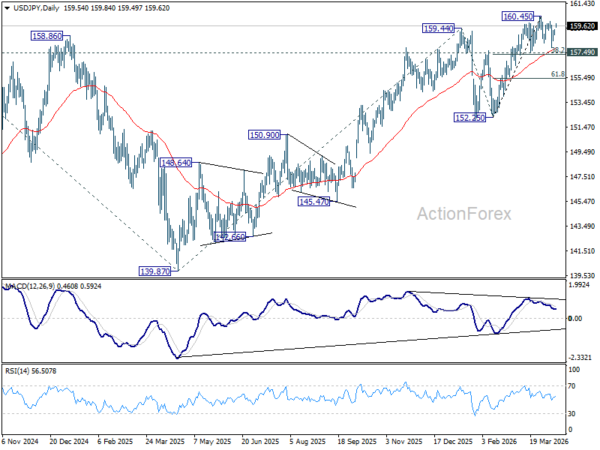 Intraday bias in USD/JPY remains neutral for the moment. Consolidations from 160.45 could still extend further. But outlook will stay bullish as long as 157.49 cluster support (38.2% retracement of 152.25 to 160.45 at 157.31) holds. On the upside break of 160.45 will target a retest on 161.94 high. However, firm break of 157.31/49 will bring deeper fall back to 61.8% retracement at 155.38 next.