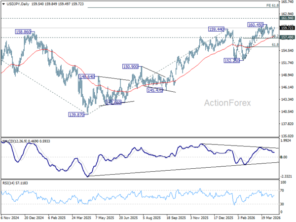Intraday bias in USD/JPY remains neutral for the moment. Consolidations from 160.45 could still extend further. But outlook will stay bullish as long as 157.49 cluster support (38.2% retracement of 152.25 to 160.45 at 157.31) holds. On the upside break of 160.45 will target a retest on 161.94 high. However, firm break of 157.31/49 will bring deeper fall back to 61.8% retracement at 155.38 next.