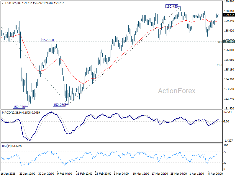Intraday bias in USD/JPY remains neutral for the moment. Consolidations from 160.45 could still extend further. But outlook will stay bullish as long as 157.49 cluster support (38.2% retracement of 152.25 to 160.45 at 157.31) holds. On the upside break of 160.45 will target a retest on 161.94 high. However, firm break of 157.31/49 will bring deeper fall back to 61.8% retracement at 155.38 next.
