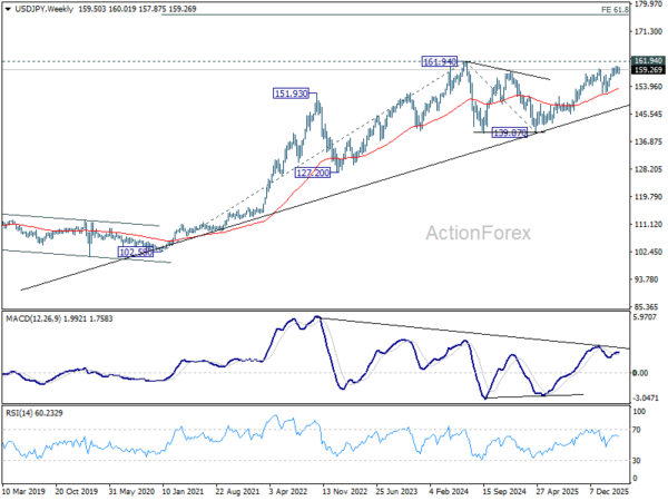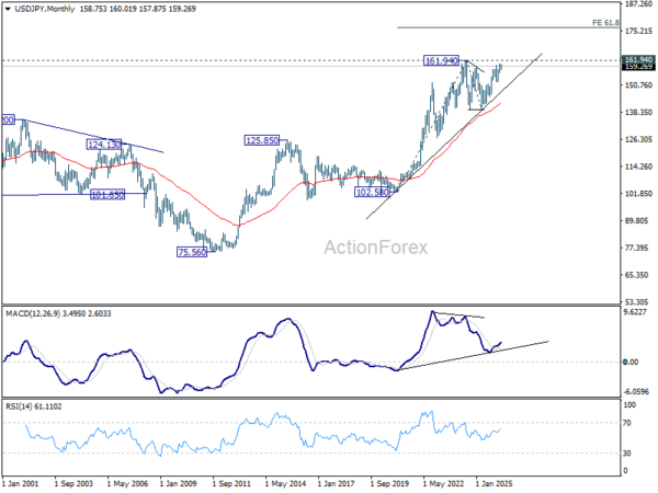In the bigger picture, outlook is unchanged that corrective pattern from 161.94 (2024 high) should have completed with three waves at 139.87. Larger up trend from 102.58 (2021 low) could be ready to resume through 161.94. This will remain the favored case as long as 55 W EMA (now at 155.24) holds. Firm break of 161.94 will pave the way to 61.8% projection of 102.58 to 161.94 from 139.87 at 176.75.