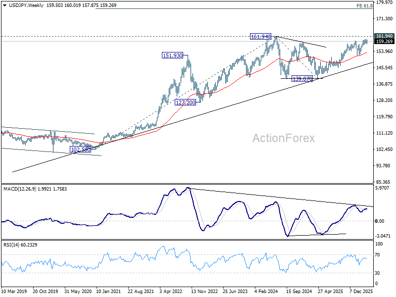 In the bigger picture, outlook is unchanged that corrective pattern from 161.94 (2024 high) should have completed with three waves at 139.87. Larger up trend from 102.58 (2021 low) could be ready to resume through 161.94. This will remain the favored case as long as 55 W EMA (now at 155.24) holds. Firm break of 161.94 will pave the way to 61.8% projection of 102.58 to 161.94 from 139.87 at 176.75.