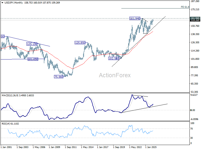 In the long term picture, up trend from 75.56 (2011 low) is still in progress and might be ready to resume. Firm break of 161.94 will target 61.8% projection of 102.58 (2020 low) to 161.94 (2024 high) from 139.87 at 176.55 in the medium term. Long term outlook will stay bullish as long as 139.87 support holds, even in case of deep pullback.