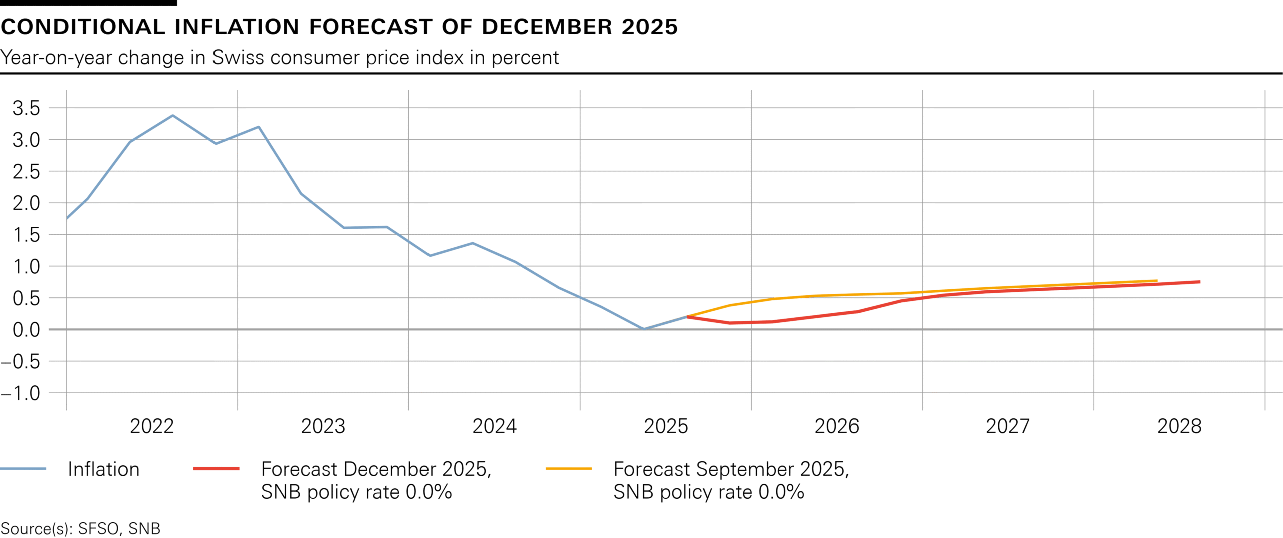 Inflationary pressure in the medium term is virtually unchanged compared to the previous quarter. Although the conditional inflation forecast is somewhat lower in the short term than in September, there is only little change in the medium term. The forecast is within the range of price stability over the entire forecast horizon (cf. chart). It puts average annual inflation at 0.2% for 2025, 0.3% for 2026 and 0.6% for 2027 (cf. table). The forecast is based on the assumption that the SNB policy rate is 0% over the entire forecast horizon.