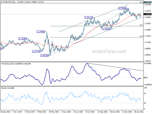 In the bigger picture, rise from 1.0635 is seen as the third leg of the pattern from 1.0339 (2017 low). Further rally could be seen to cluster resistance at 1.2555 next, (38.2% retracement of 1.6039 to 1.0339 at 1.2516). This will remain the favored case as long as 1.1602 support holds. We’d be alerted to topping sign around 1.2516/55. But sustained break there will carry long term bullish implications.