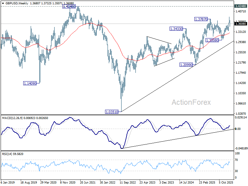 In the bigger picture, rise from 1.0351 (2022 low) is resuming by breaking through 1.3787 high. Further rally should be seen to 1.4284 key resistance (2021 high). Decisive break there will add to the case of long term bullish trend reversal. For now, outlook will stay bullish as long as 1.3008 support holds, even in case of deep pullback.