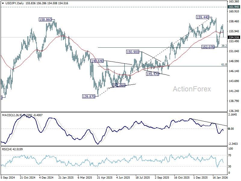 Intraday bias in USD/JPY stays on the downside for 152.07 support. Price actions from 159.44 are still seen as a corrective pattern only. Hence, downside should be contained by 38.2% retracement of 139.87 to 159.44 at 151.96 to bring rebound. On the upside, above 154.57 minor resistance will turn intraday bias neutral first. However, sustained break of 151.96 will argue suggests that it's reversing the rise from 139.87 already.