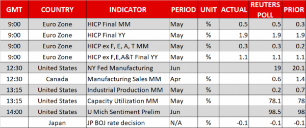 FOREX: The euro edged higher by 0.26% versus the US dollar on Friday but was set to post its biggest weekly loss in 19 months after the European Central Bank (ECB) signaled it will keep rates at record lows until late 2019, pushing euro/dollar down by more than 250 pips at one point on Thursday. Meanwhile, Eurozone’s final CPI readings for May were in lie with preliminary estimates, with ECB member, Ewald Nowotny, saying that the central bank’s inflation target of just below 2.0% is close to be achieved. Sterling started the day in negative territory amid rising Brexit tensions, challenging $1.3210 but managed to move higher later, gaining 0.11% against the greenback. Dollar/yen was flat at 110.65, below the almost one-month high of 110.89 reached earlier after the Bank of Japan (BOJ) kept its policy unchanged but downgraded its assessment on inflation earlier on Friday. Meanwhile, the US dollar index reached a 7-month high of 95.13 before it slid to 94.87 (+0.11%). Trade uncertainties continued to weigh on the greenback as the EU backed a retaliatory plan against US import tariffs on Thursday, while India also joined later on, announcing potential countermeasures on US goods. In the antipodean sphere, aussie/dollar touched a 1-month low of 0.7450 today, falling by 0.20%, while kiwi/dollar dived by 0.43% to 0.6952. Dollar/loonie rose by 0.34% towards a new 1-year high of 1.3153.