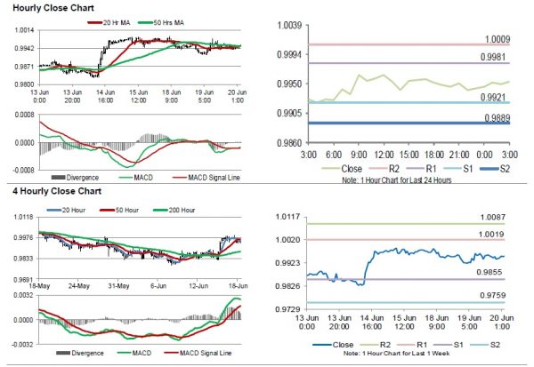 The pair is expected to find support at 0.9921, and a fall through could take it to the next support level of 0.9889. The pair is expected to find its first resistance at 0.9981, and a rise through could take it to the next resistance level of 1.0009.