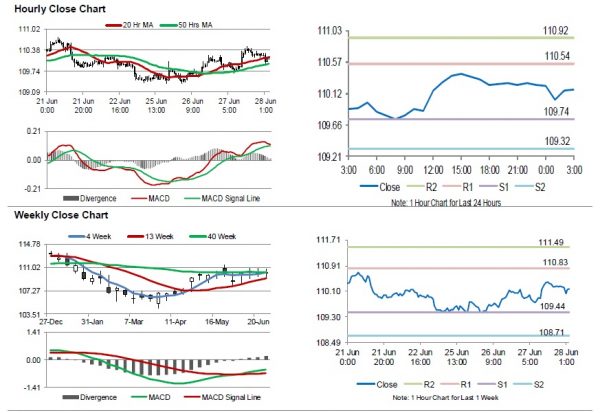 In the Asian session, at GMT0300, the pair is trading at 110.17, with the USD trading 0.06% lower against the JPY from yesterday’s close.